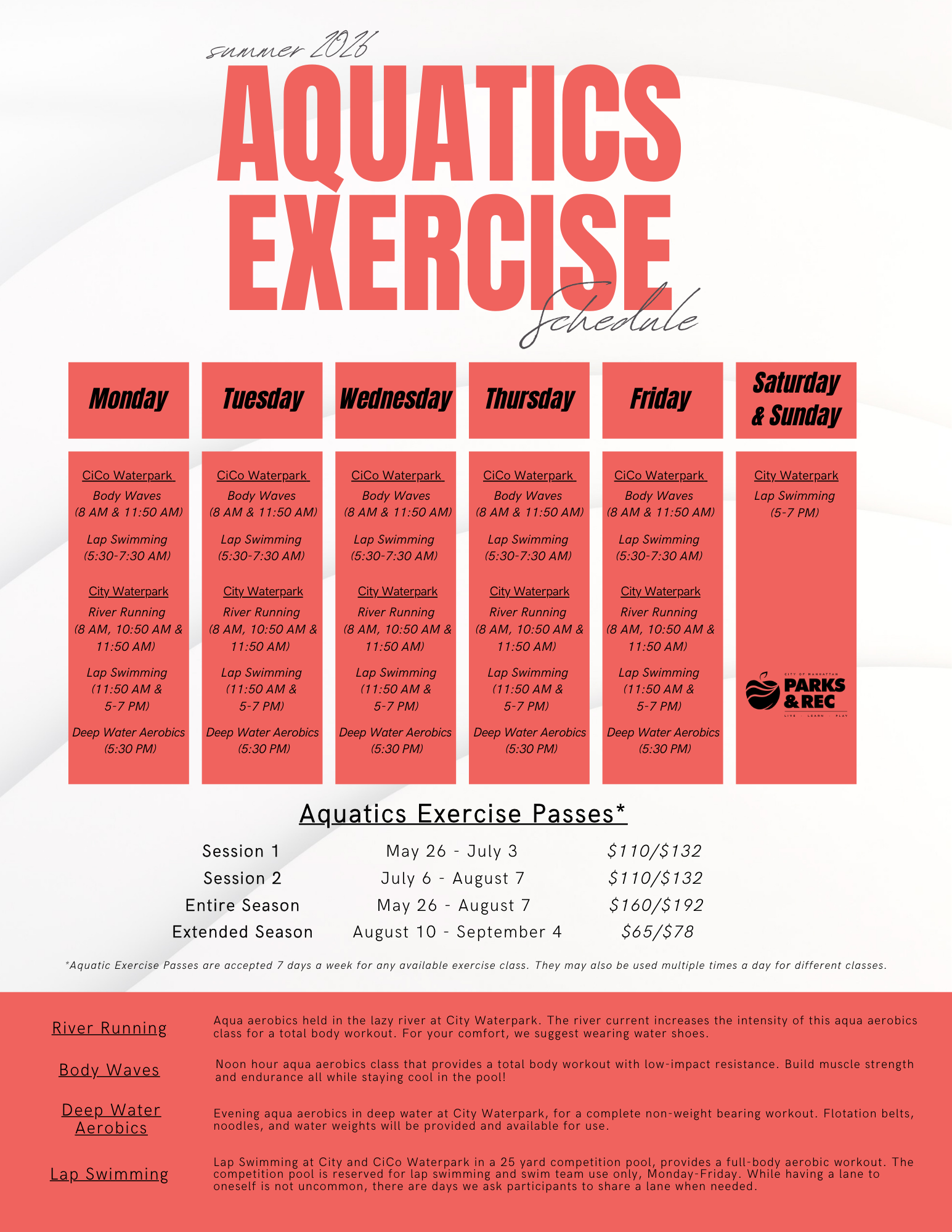 Schedule for Aquatics Classes for the 2026 summer at the Manhattan Parks and Recreation Waterparks